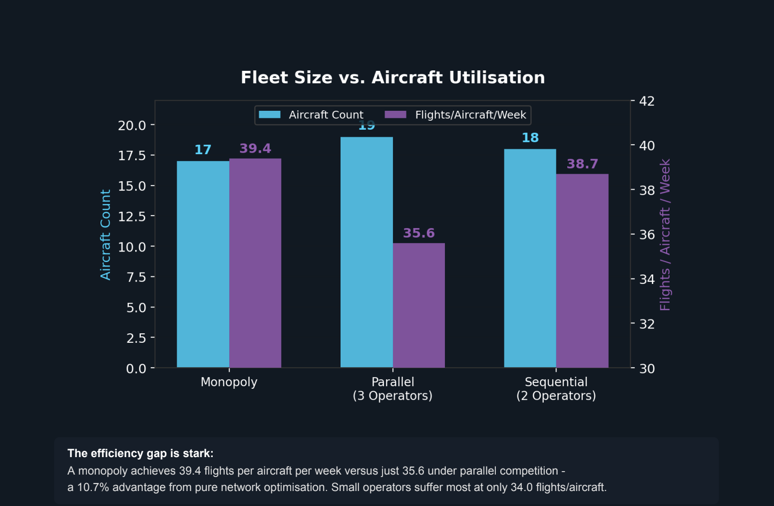 Under parallel competition, however, the same demand required 19 aircraft but produced only marginally more flights. Smaller operators in the competitive scenario struggled the most, averaging just 34 flights per aircraft per week.