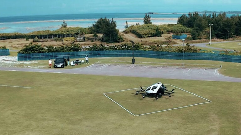 Several company social media posts explained the flight trial saw an EHang 216 passenger AAV fly two kilometres between Iheya Island and Noho Island in the Okinawa Prefecture. These are small, remote islands north of the main island of Okinawa, connected to each other by a narrow land bridge.