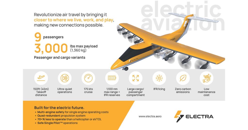 Electra’s Ultra Short aircraft integrates blown lift and hybrid-electric propulsion to take off and land in just 150 ft, which is around 10 percent of the footprint required for similarly-sized legacy airplanes.