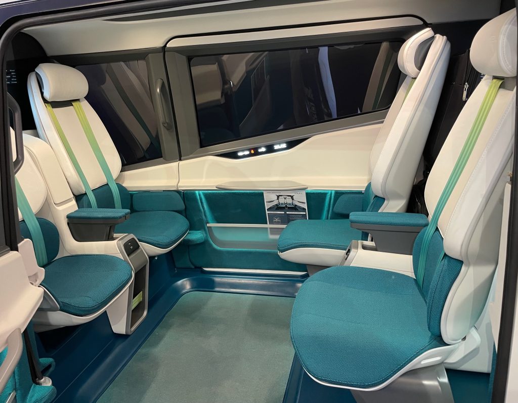 The inside mock-up at Farnborough showed a single pilot seat at the front, with 4 passenger seats behind it – two forward-facing and two rear-facing. Eve aims to begin a commercial service by 2026.