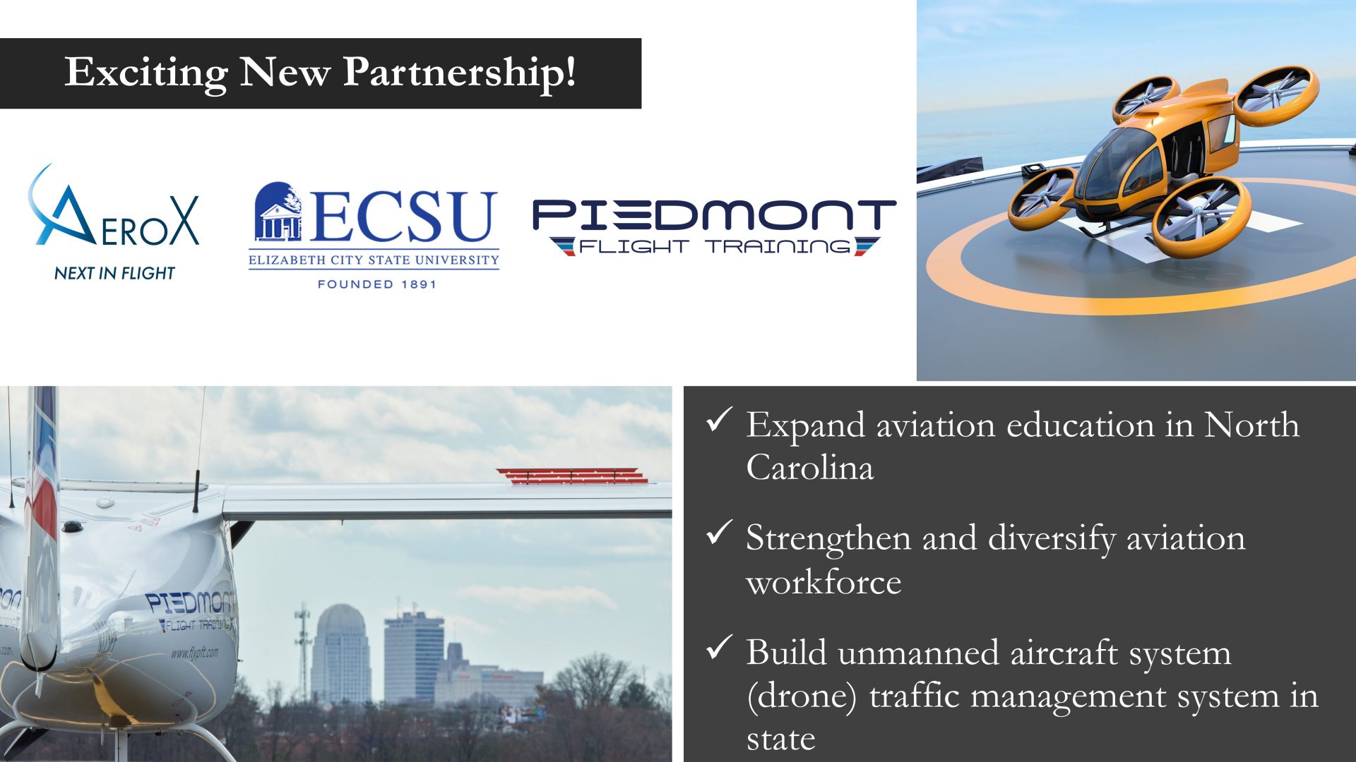 Three’s a Union: ECSU, AeroX, Piedmont Flight Training join forces “to pave way for Flying Cars!”