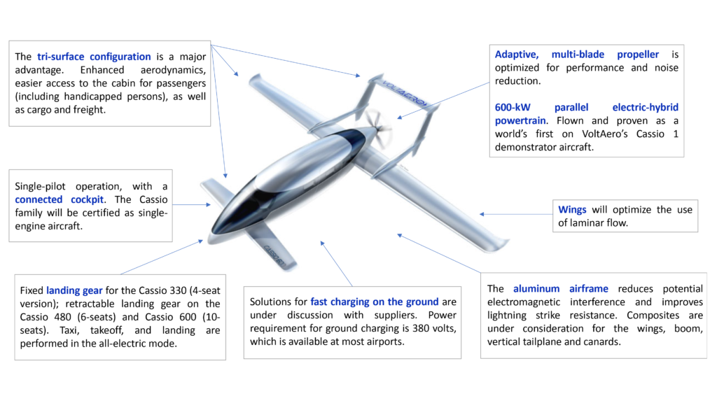 First to be certified will be the Cassio 330, with five seats and powered by the 330-kilowatt electric-hybrid propulsion system. VoltAero’s follow-on six-seat Cassio 480 will have an electric-hybrid propulsion power of 480 kilowatts, while the Cassio 600 is sized at a 12-seat capacity with electric-hybrid propulsion power of 600 kilowatts.